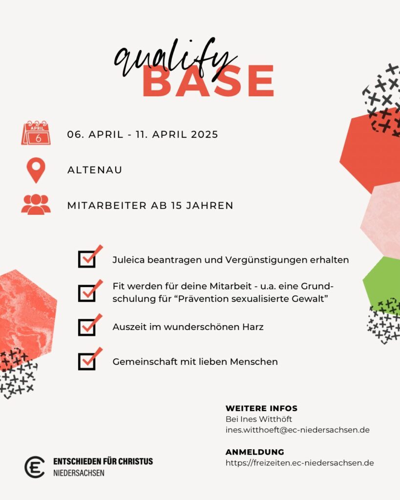 Das Juleica-Seminar: An sechs Tagen in Altenau möchten wir euch in den Grundlagen der Mitarbeit fit machen. Auf dich wartet ein breites Themenfeld von A wie „Aufsichtspflicht“ über M wie „Motivation“ bis Z wie „Zuschüsse“. Dazu gibt es kreative Aktionen und viel Zeit für Gemeinschaft. Nach dem Besuch von qualifyBASE kannst du die Juleica beantragen.