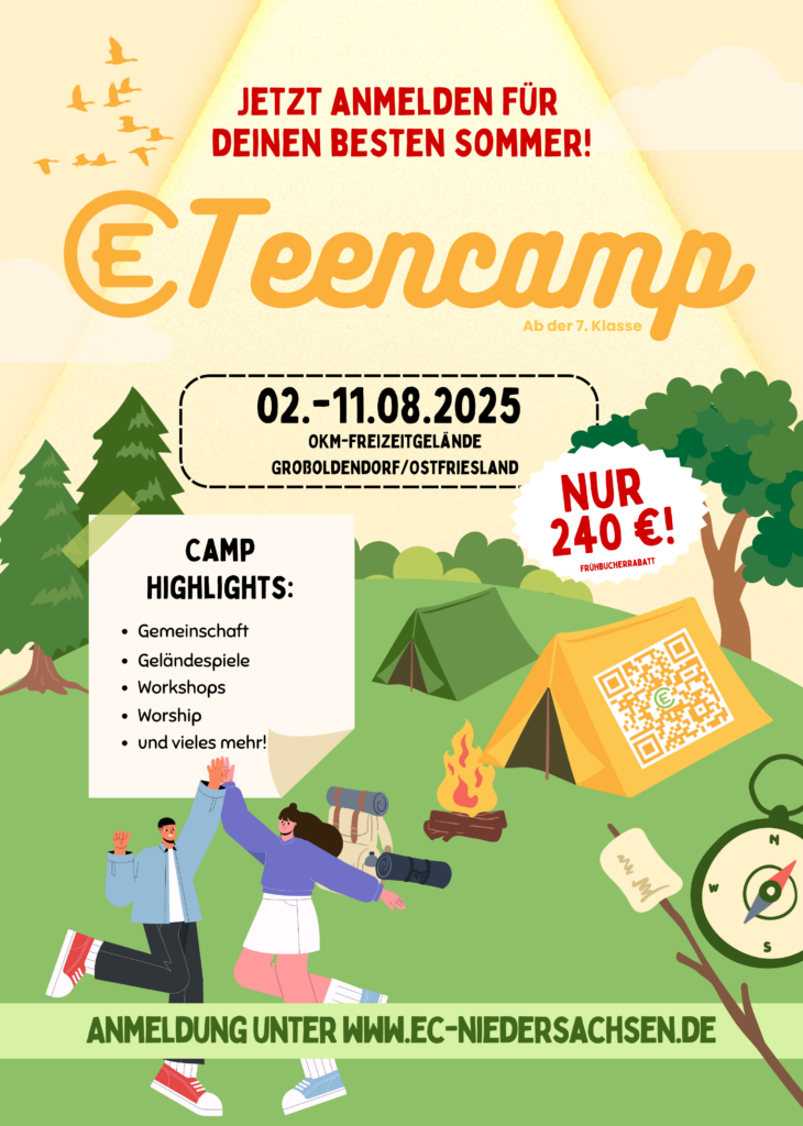 Das EC TEENCAMP öffnet auch 2025 wieder seine Tore! Freu dich auf 10 unvergessliche Tage voller Gemeinschaft, Worship, actionreiche Geländespiele, Spiele- und Galaabende, leckeres Essen und eine großartige Zeit mit vielen neuen Leuten und einem motivierten Team. Melde dich jetzt an und lade auch deine Freunde zu diesem Highlight des Jahres ein!